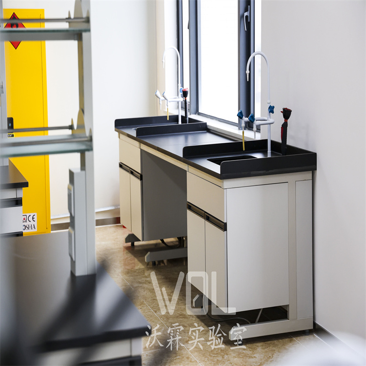 核心配置:每工位配实芯理化板实验台(带导流槽)、万向抽气罩(风速 0.3-0.5m/s)、纯水接口与双电压电源;集中放置 5-10L 高剪切乳化机、小型搅拌釜、超声波分散仪等小试设备。