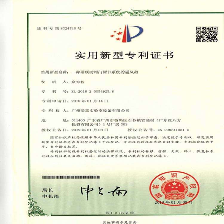 专利证书——带联动阀门调节系统的通风柜