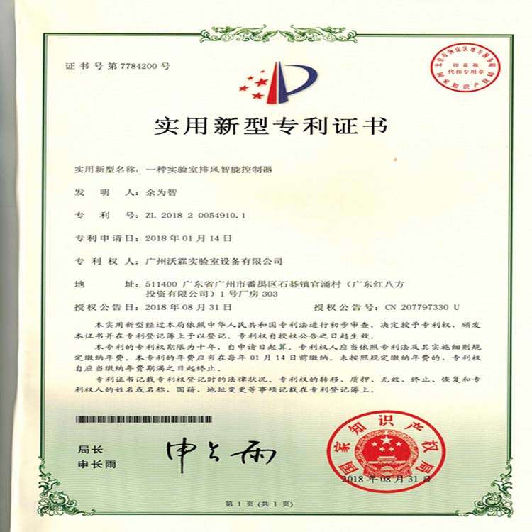 专利证书——实验室排风智能控制器